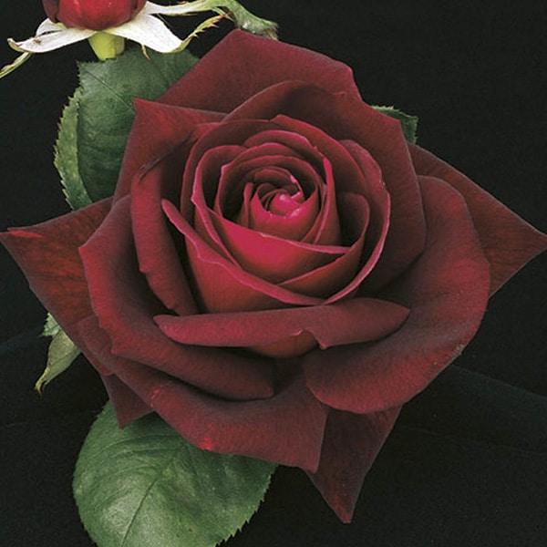There's something alluring and mysterious about the near-black flowers. This is the darkest rose we offer. Its black pointed buds gracefully open to very well-formed velvety dark red blooms. Super large dark green foliage covers the bushy plant. Stands up to all types of weather. Very dark. Size can shrink in heat.